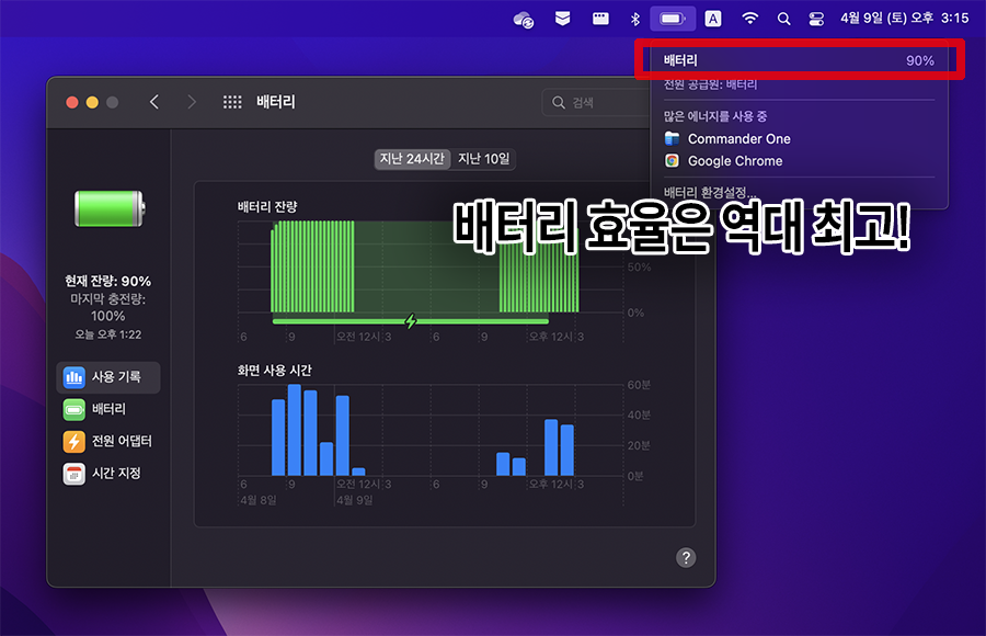 ์ ํ ์ค๋ฆฌ์ฝ M1 Pro ์นฉ์ ์ฌ์ฉํ๋ฉด์ ์ด๋ง์ด๋งํ๊ฒ ๊ฐ์ ๋ ๋ฐฐํฐ๋ฆฌ ์ง์์๊ฐ ๋๋ถ์ ๋๋ค. ํนํ ์ต๋์ฑ๋ฅ์ ๋ด๋ฉด์๋ ์ด์ ๋ ๋ฐฐํฐ๋ฆฌ ํจ์จ์ด ๋์จ๋ค๋ ๊ฒ์ด ์ ๋ง ๋๋๊ธฐ๋ง ํ๋ค์. 2~3์๊ฐ์ ์ฌ์ฉํ๋๋ฐ๋ ์ค์ด๋ ๋ฐฐํฐ๋ฆฌ๋ ๊ฒจ์ฐ 10% ์ ๋ ์ ๋๋ค. ๋ด๊ฐ ๋ ธํธ๋ถ์ ์ฌ์ฉํ๊ณ ์๋๊ฑด์ง, ์์ดํจ๋ ๊ฐ์ ํ๋ธ๋ฆฟ์ ์ฌ์ฉํ๊ณ ์๋ ๊ฑด์ง ๊ตฌ๋ถ์ด ์๊ฐ ์ ๋๋ก ๋ฐฐํฐ๋ฆฌ ์๊ฐ์ด ๊น๋๋ค.