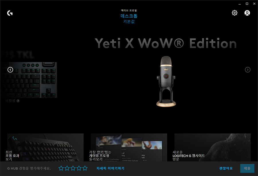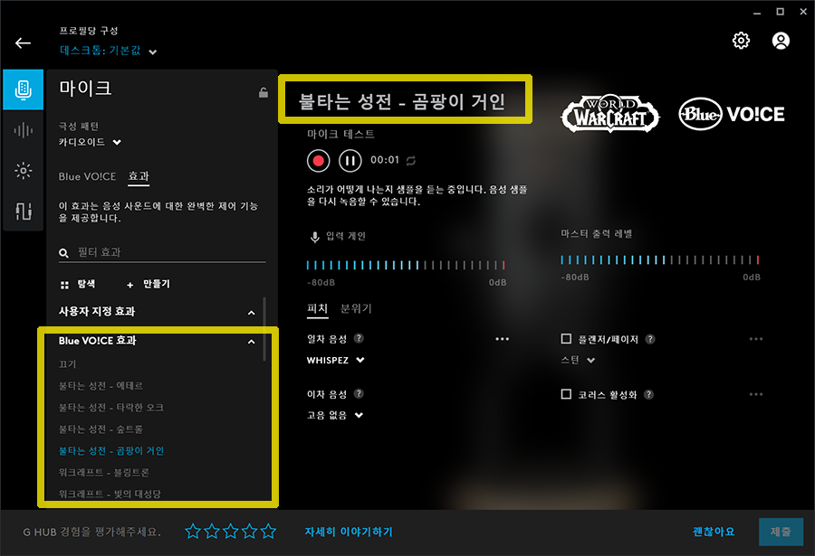 로지텍 G Hub에 연결해보니 Yeti X WoW Edition이라고 뜹니다. 일반 모델과 다른게 있나.. 살펴보니 Blue Voice 효과중에 와우의 불타는성전 프리셋이 있네요. 이걸로 녹음을 하고 들어보면... 게임에 나오는 캐릭터들의 목소리로 둔갑을 합니다. 이런 효과 놀이 재밌네요.