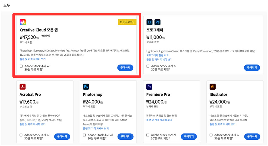 먼저 위에 사이트로 이동을 하면 아래와 같은 어도비 구독 플랜을 볼 수 있습니다. 당연히 지금 할인 중이 Creative Cloud 모든 앱을 구독하시면 됩니다. 원래대로라면 월 62,000원씩 지불해야 하는데, 지금 구입하시면 월 47,520원이죠. ^^