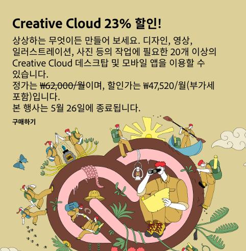 아무튼, 어도비 CC 모든 앱 플랜 구독을 앞두고 계셨다면, 2022년 5월 26일까지 이어지는 23% 할인 행사를 놓치지 마세요 :)