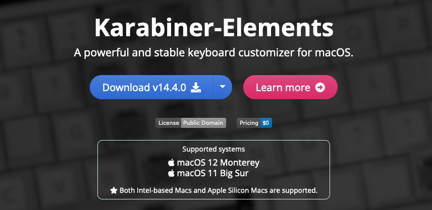 ๋จผ์ ์์ ์ฌ์ดํธ์์ Download ๋ฒํผ์ ํด๋ฆญํด์ karabiner elements dmg ์ค์น ํจํค์ง๋ฅผ ๋ค์ด๋ก๋ ๋ฐ๊ณ , ํด๋น ํ์ผ์ ์ด์ด์ ์์ ์๋ pkg ํ์ผ์ ์ค์นํ์๋ฉด ๋ฉ๋๋ค.