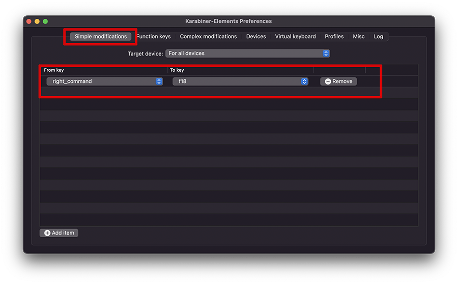 ์ฒ์์ ๋ณด์ด๋ Simple Modifications์์ ์ผ์ชฝ ํ๋จ์ ์๋ +Add Item๋ฅผ ๋๋ฅธ ๋ค, ์ค๋ฅธ์ชฝ ์ปค๋งจ๋ํค(right_command)ํค๋ฅผ f18ํค๋ก ์ค์ ํด์ฃผ์๋ฉด ๋ฉ๋๋ค. ์ f18ํค๋๊ณ ํ์๋ฉด... ๋ฑํ ๊ทธ ํค์ ์ถฉ๋๋๋ ํค๊ฐ ์๊ธฐ ๋๋ฌธ์ด์ฃ . ^^ ์ ๋นํ F13~F20 ์ค ์์ฃผ ์ฐ์ง ์๋ ํค๋ฅผ ์ค์ ํ์ ๋ ๋ ๊ฒ ๊ฐ์ต๋๋ค.