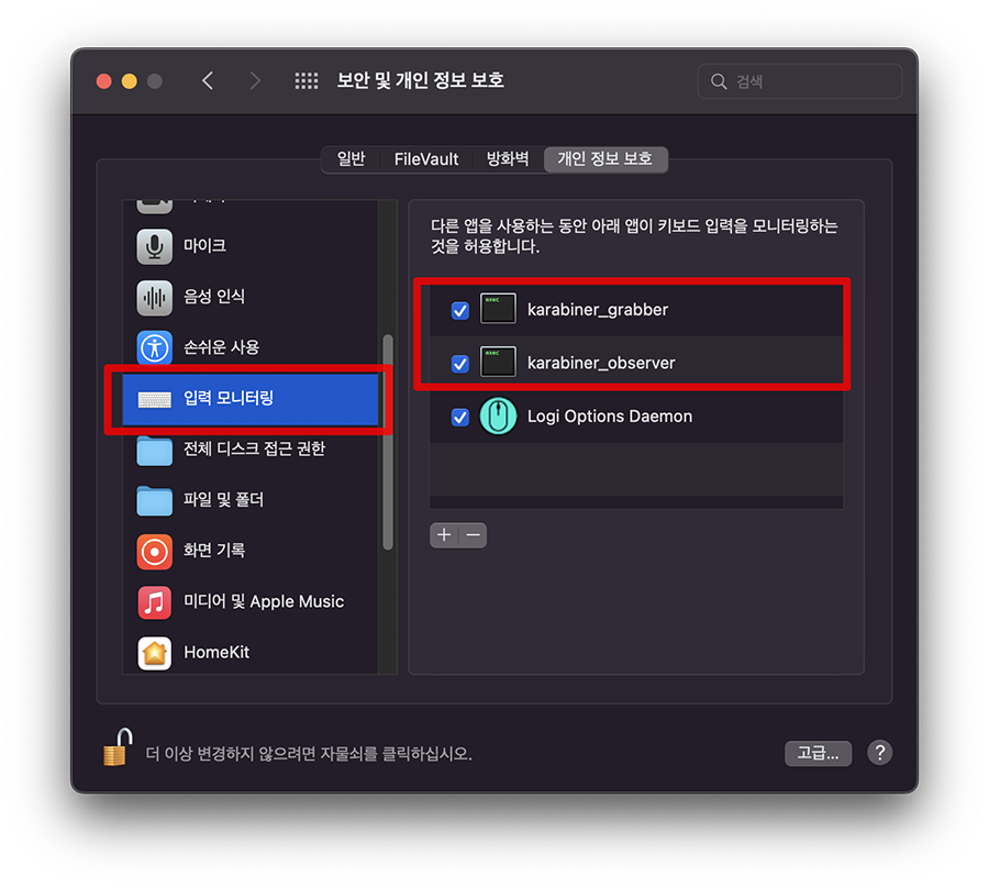 ๊ทธ๋ฆฌ๊ณ ๊ฐ์ธ์ ๋ณด ํญ์์ ์ ๋ ฅ ๋ชจ๋ํฐ๋ง์ ์๋ karabiner_grabber, karabiner_observer ์ญ์ ์ฒดํฌํด์ฃผ์ด์ผ ํ๊ตฌ์.