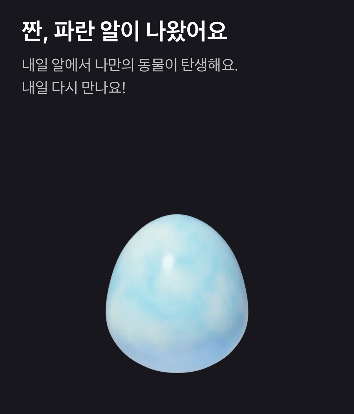 저는 파란알이 나왔습니다. 짝수 회차는 자물쇠가 그려져 있는데, 이때 내 동물이 진화를 한다고 하네요. 그럼 조금씩 조금씩 변해서 성장하는 모습을 볼 수 있겠죠?