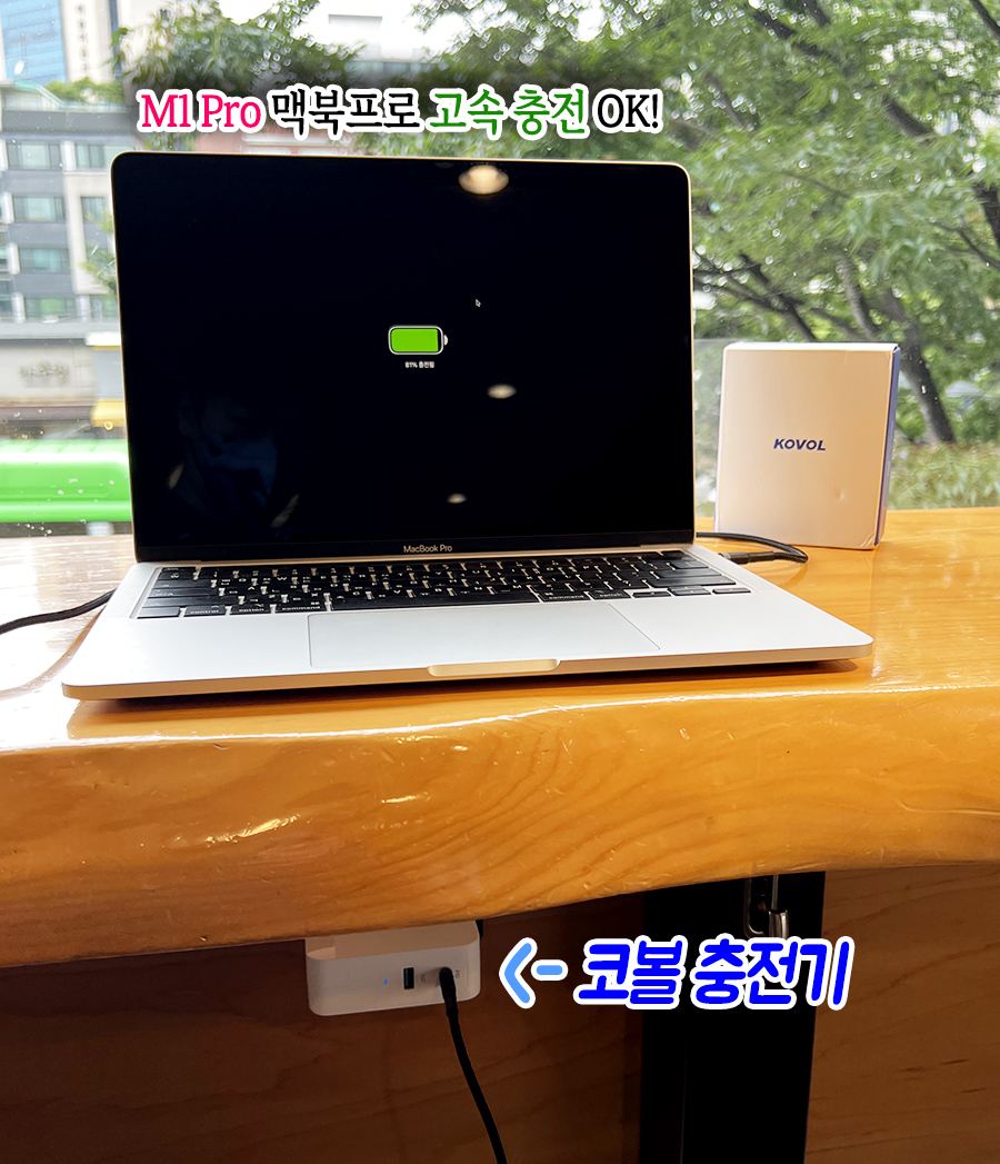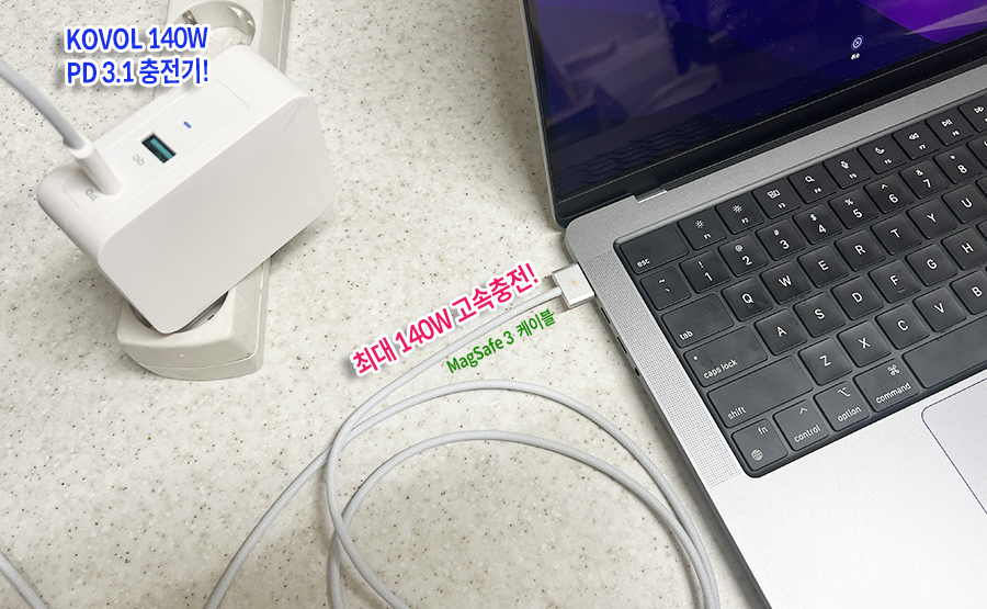 MagSafe3 전용 케이블과 KOVOL 충전기를 조합하면 더 빠른 급속충전이 가능합니다. 괜히 USB PD3.1를 지원하는 140W 충전기로 나온 것이 아니니까요. 맥세이프3 (MagSafe3) 케이블을 연결해서 고속충전도 테스트해보니 출력이 꽤 안정적이고 역시 빠릅니다. 16인치 신형 맥북프로를 30분만에 50% 이상 고속충전 하는 것이 가능하기에 빠른 충전이 필요한 분들에게는 꽤 메리트가 있습니다. ^^