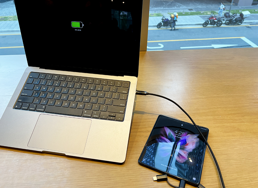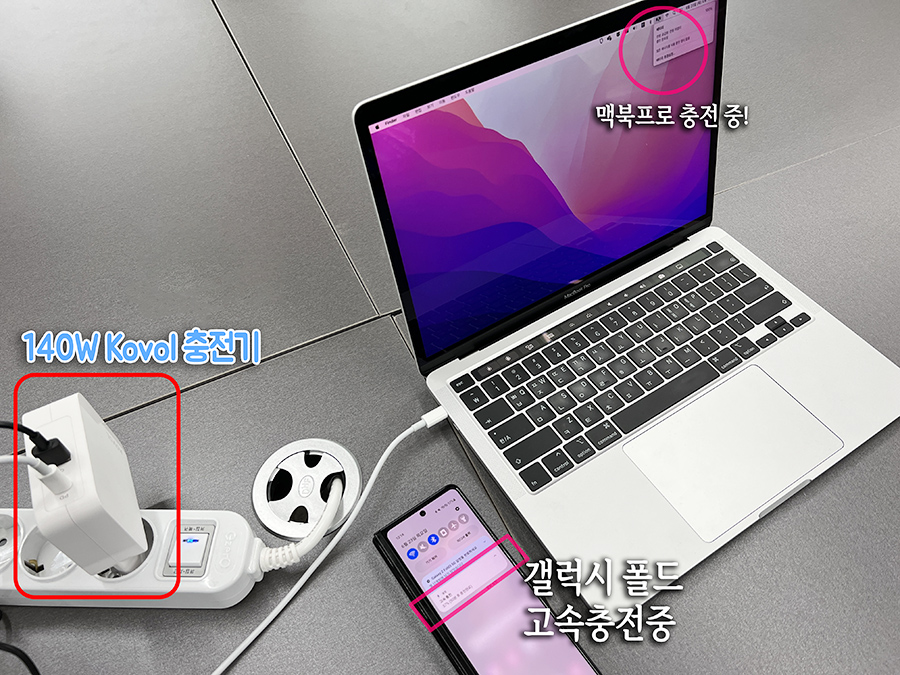 역시 최대출력 140W라서 그런지 빵빵한 고속충전이 가능하네요. 맥북프로 13인치 터치바 모델을 최대 출력으로 충전하면서도, 갤럭시Z폴드3 스마트폰도 고속충전이 가능합니다. ^^