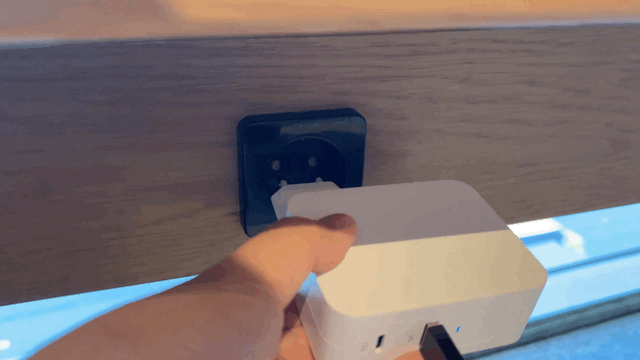 위와 같이 조금 안쪽으로 플러그가 모여있어서, 전기 아울렛에 꽂으면 꽤 고정이 잘 되는 편입니다. 아래와 같이 살짝 아래로 경사면이 있는 전기 콘센트에도 별다른 문제 없이 꽤 안정적으로 사용을 할 수 있었습니다.