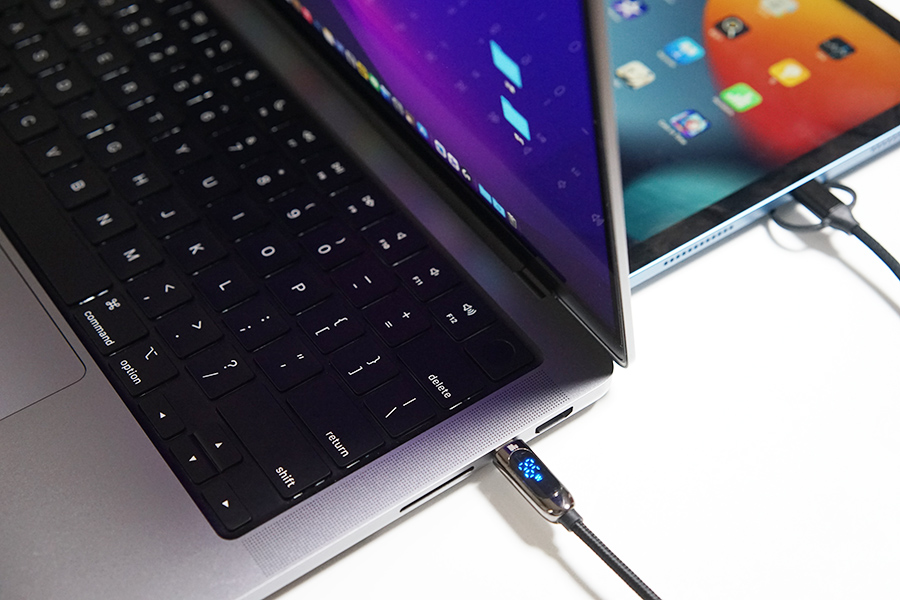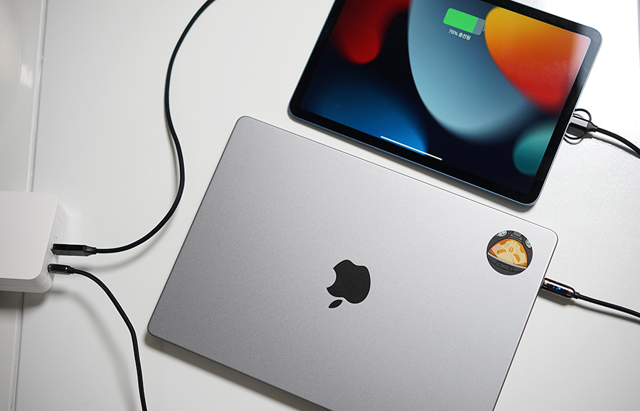 지금 사용하고 있는 M1 맥북프로 14인치의 경우 USB C to C 케이블로 출력을 테스트해보니, 약 86W로 측정이되더군요. 고속 충전을 하면서도 동시에 아이패드 에어를 함께 충전할 수 있을 정도로 안정적이네요.