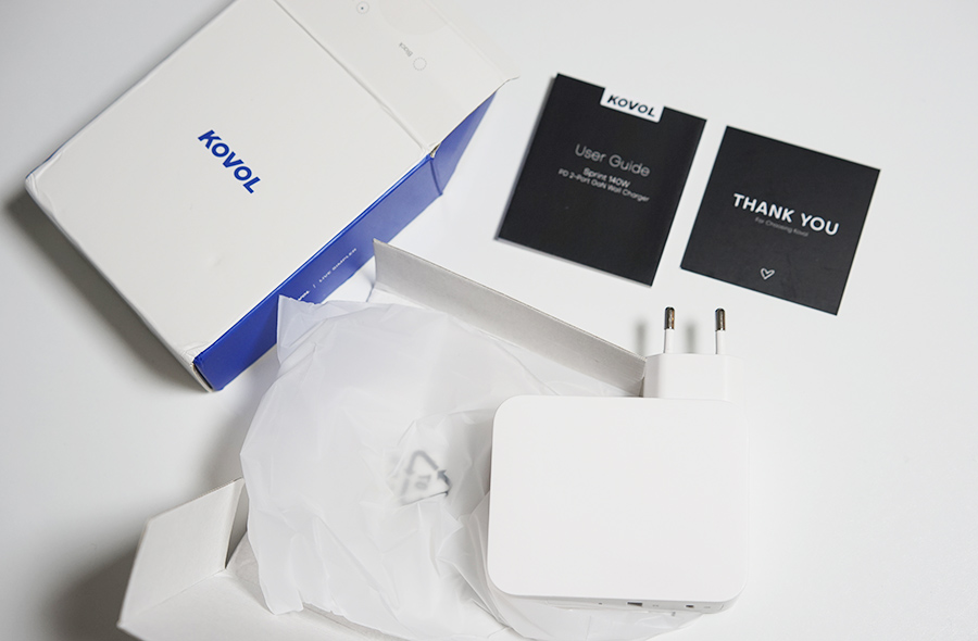 코볼 KOVOL GaN3 140W 충전기를 개봉해보면, 일단 살짝 묵직한 무게에서 140W 충전 어댑터의 위엄(?) 체감할 수 있습니다.