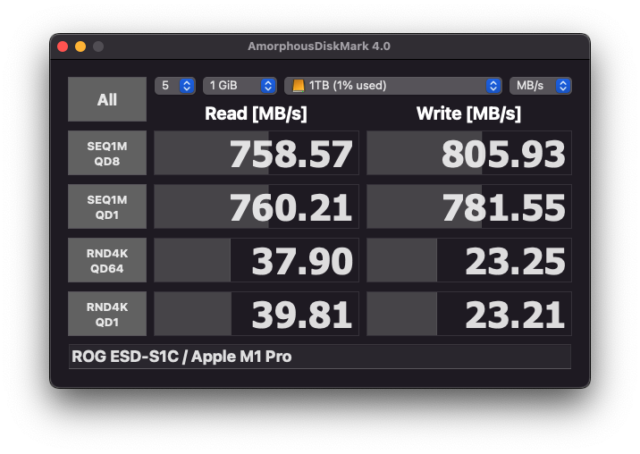 자 그럼 ASUS ROG ARION 외장 SSD를 연결해보았습니다. 사용하고 있는 맥북프로 14인치 모델에서 속도 테스트를 해보니..