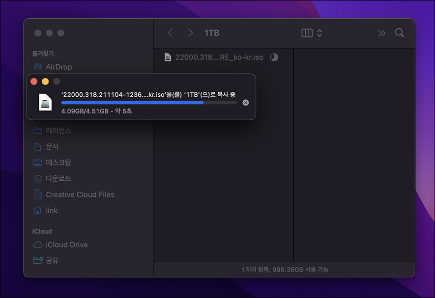 약 4GB 정도 되는 ARM 윈도우 ISO 이미지 파일을 복사를 해봤습니다. 20초 이내에 복사가 완료되는 것을 확인할 수 있죠. 정말 순식간 입니다. 이제 대용량 파일을 외장하드(외장 SSD)에 옮길 때 속시원하게 작업할 수 있겠네요.