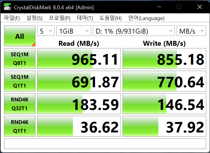 Mac에서 스토리지 속도를 쉽게 측정해볼 수 있는 Amorphous Disk Mark로도 측정해보았습니다. 또한 윈도우 게이밍 노트북에서 Crystal Disk Mark로 측정해보니 최대 읽기 속도는 965MB/s 까지도 나오는군요.