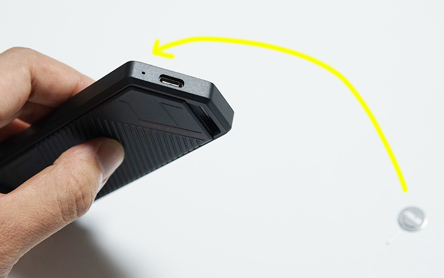 하단 부분에 USB Type-C로 연결을 할 수 있고, 자세히 보면 핀이 있습니다. 이걸 동봉된 핀을 눌러야 커버가 열리는 구조 입니다.