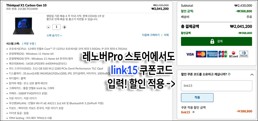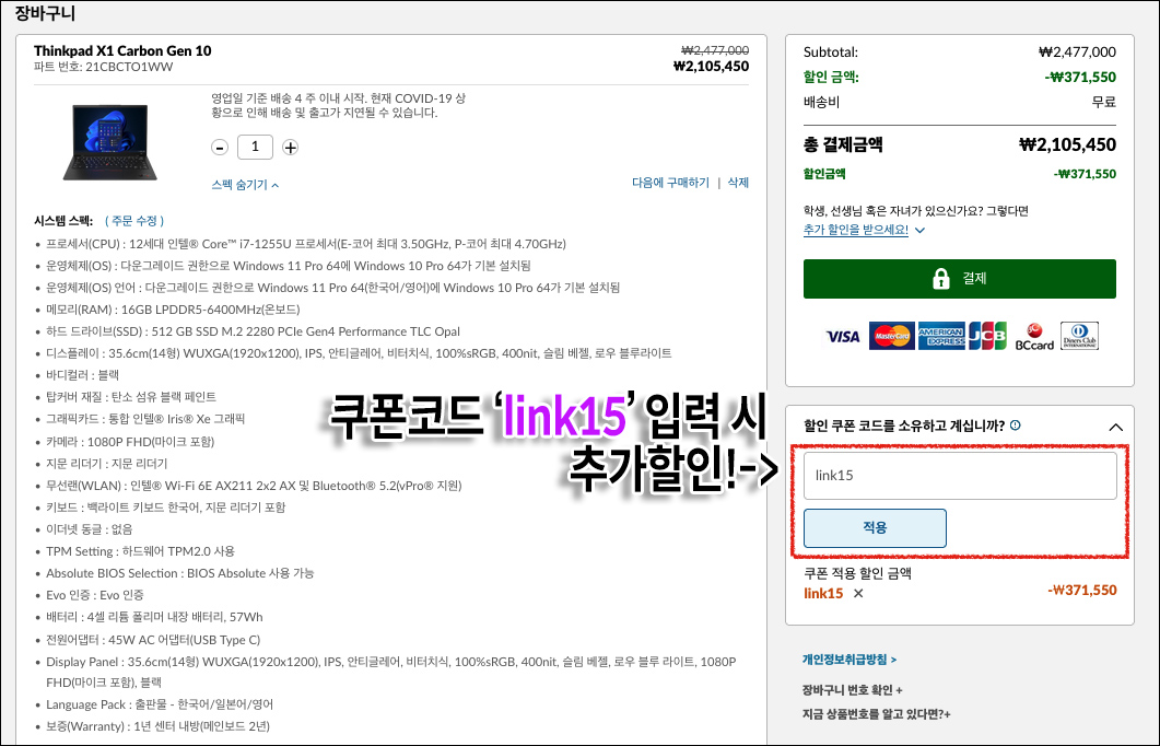 제가 고른 사양으로 맞추니 정가 기준으로는 247만원이나 하는데요. 여기서 쿠폰코드 link15를 모두 소문자로 입력한 뒤, '적용' 버튼을 누르면 레노버 및 씽크패트 노트북 모델에 따라 최대 15~17%까지 할인이 됩니다. 결과적으로 인텔 12세대 i7-1255U, DDR5 16GB 램, 512GB SSD를 탑재한 씽크패드 X1 카본 10세대 주문제작 업그레이드 모델을 할인받아 약 210만원에 구입이 가능하네요.