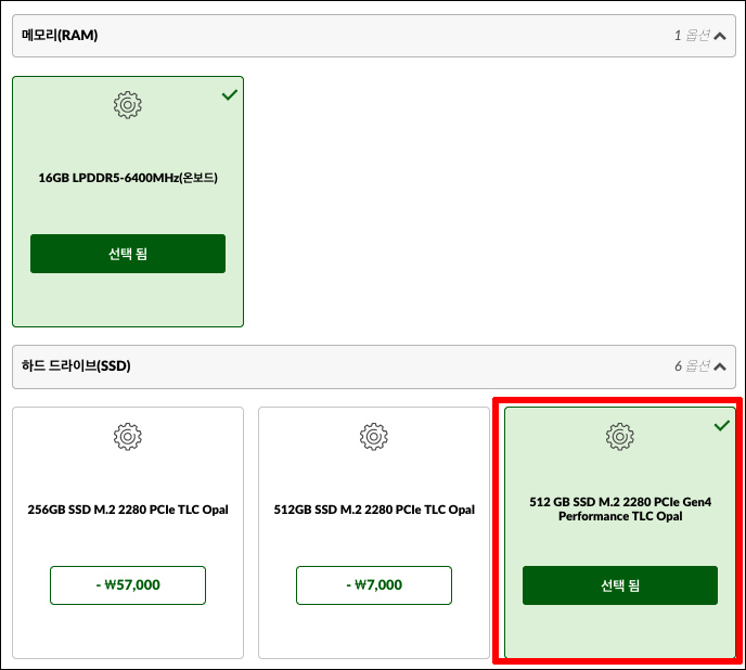 램의 경우에는 DDR5 16GB에서 더 올릴 수가 없으니 그냥 놔두면 되고, 스토리지는 개인적으로 5만원 정도를 더 투자해서 512GB dㅣ상으로 가시는 것을 추천합니다. 여유가 있다면 1TB로 올리는 것도 나쁘지 않겠죠. 저는 512GB SSD Gen4를 고르시는 것을 추천해봅니다.