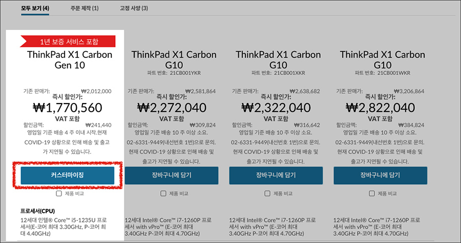먼저 위에 링크를 통해 레노버 씽크패드 X1 Carbon 10세대 모델 공식 페이지로 갑니다. 그리고 잘 보면 아래와 같이 '커스터마이징'이라고 쓰여진 제품을 볼 수 있죠.