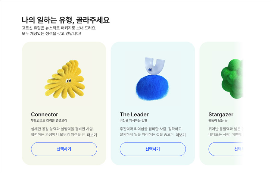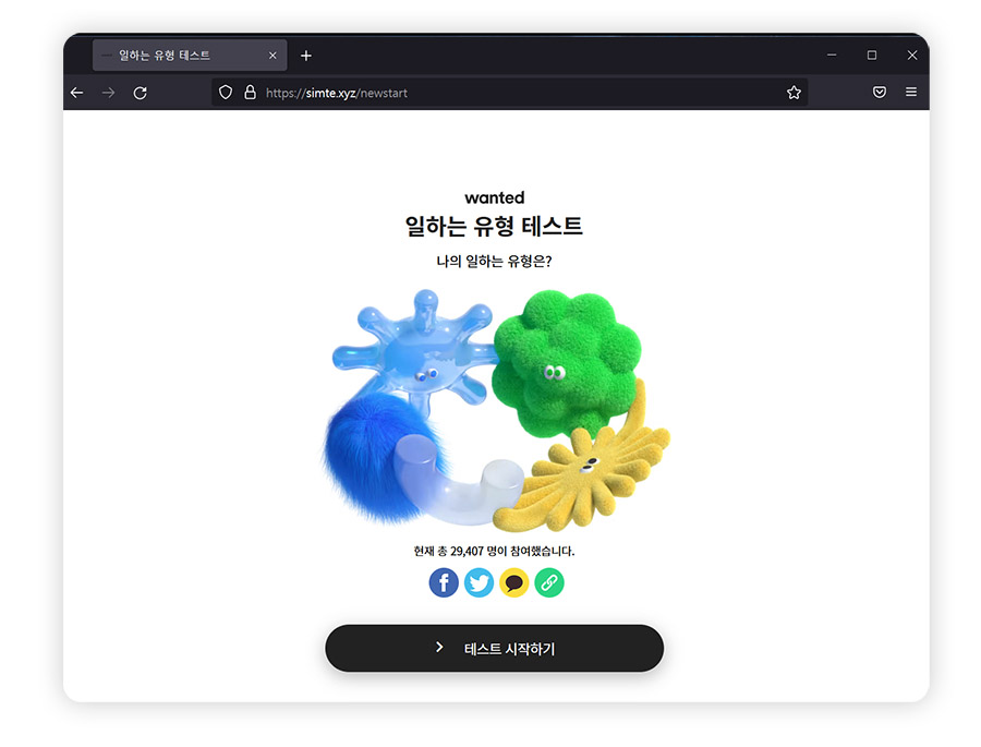 원티드 이직 성공시 고를 수 있는 일하는 유형 패키지는 위에 사이트를 통해 MBTI 심리테스트 처럼 질의응답을 하면 나의 일하는 유형이 나오는 것 같습니다. 총 10가지 문항에 답하면 되니, 관심 있으신 분들은 참여해보세요 :)