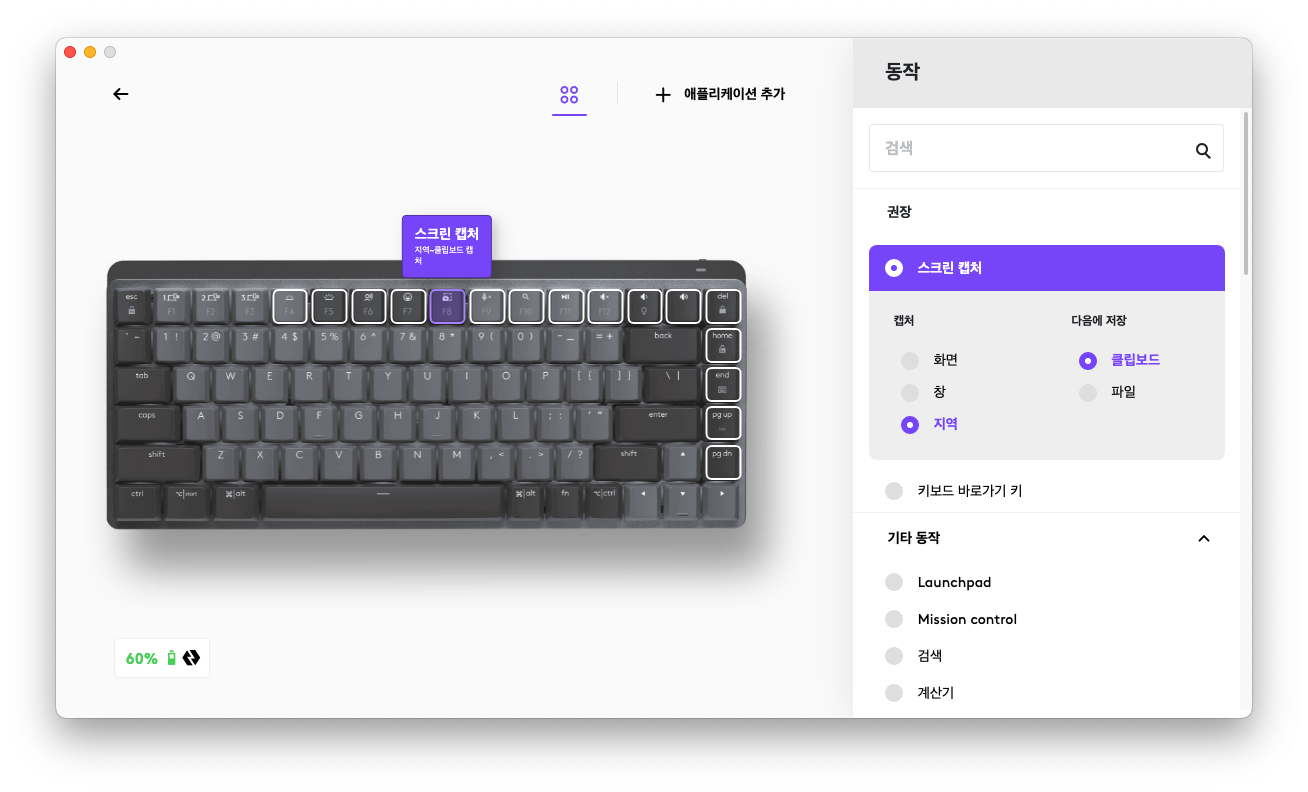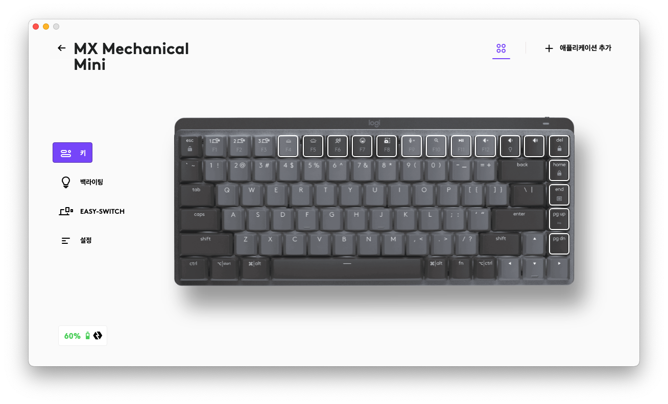 어찌되었든 로지텍 옵션스 플러스 앱에서 F4키부터 Del키 상단 키 라인, 그리고 Home~PgDn키 까지는 원하는 키로 커스텀 설정이 가능합니다.