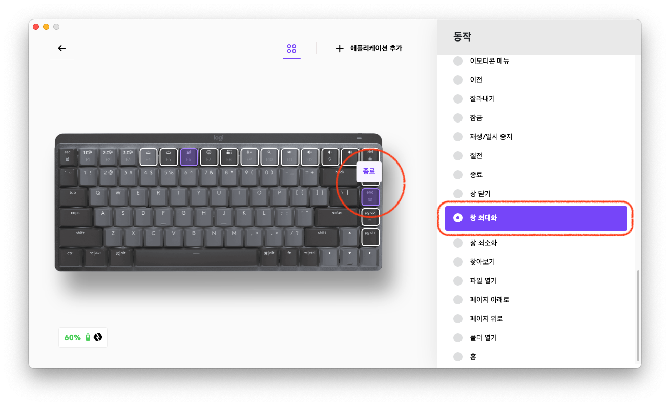 아쉽게도 로지텍 옵션스+의 한글화(?) 한국어가 약간 부실한 것 같기도 하네요. End 버튼을 일단 '종료'로 번역해 둔 것을 찾아냈습니다. ㅎㅎ
