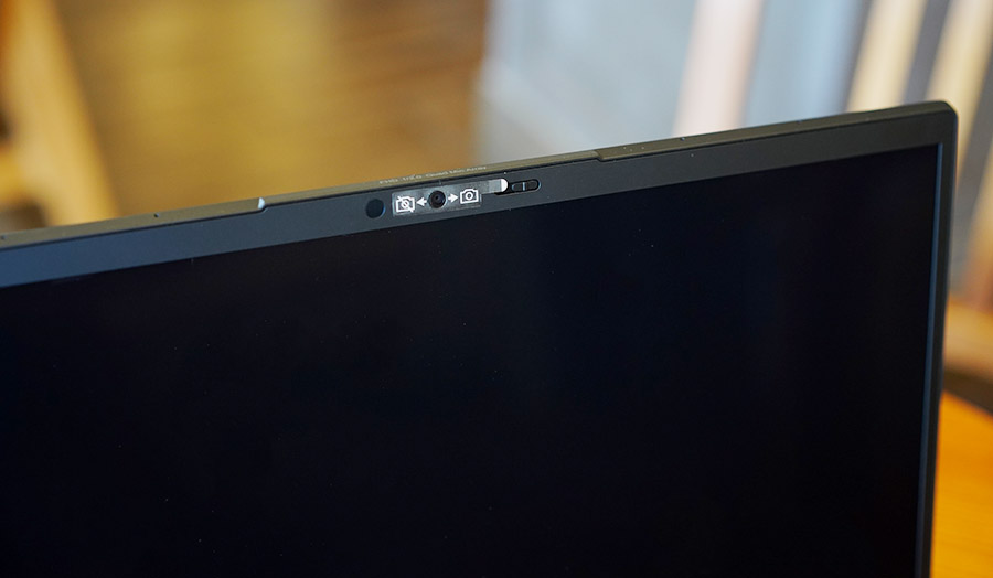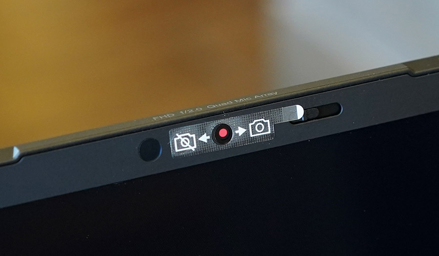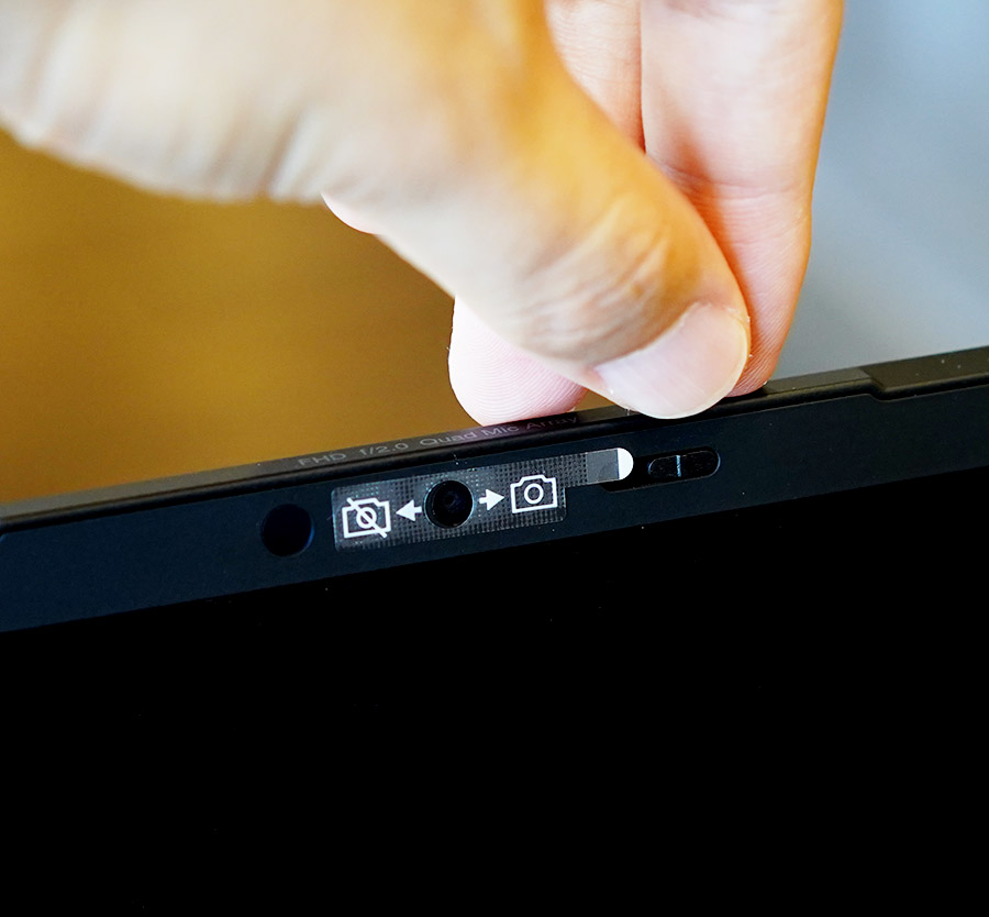비즈니스 노트북인 만큼 다양항 보안 기능을 가지고 있는데요. 먼저 얼굴인식과 프라이버시를 보호해줄 수 있는 IR카메라 옆에 있는 FHD 웹캠의 경우 Privacy Shutter가 적용되어 있습니다. 그래서 스위치를 좌우로 슬라이드 해보면 아래와 같이 커버를 막을 수 있죠.