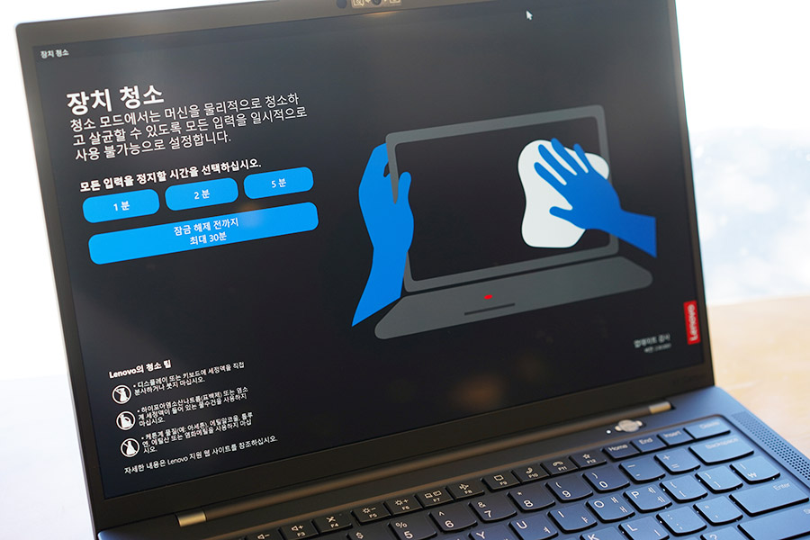 부가적으로 또 다른 앱이지만, 장치 청소를 쉽게 도와주는 기능도 있습니다. 요즘 나오는 대부분의 노트북들이 전원 키를 누르지 않고 다른 키를 누르면 파워가 들어오도록 되어 있기도 하고, 터치스크린인 경우 전원을 킨 상태에서 화면을 닦을 때 이곳저곳 눌리는 것이 신경쓰이는데요. 위에 앱을 사용하면 1분~5분 정도 키 입력을 막고 깨끗하게 청소를 할 수 있죠. 이렇게 중요한 보안기능 부터 소소한 편의기능까지 잘 갖추어져 있기에 씽크패드가 비즈니스 노트북으로 높은 평가를 받는 것 같습니다.