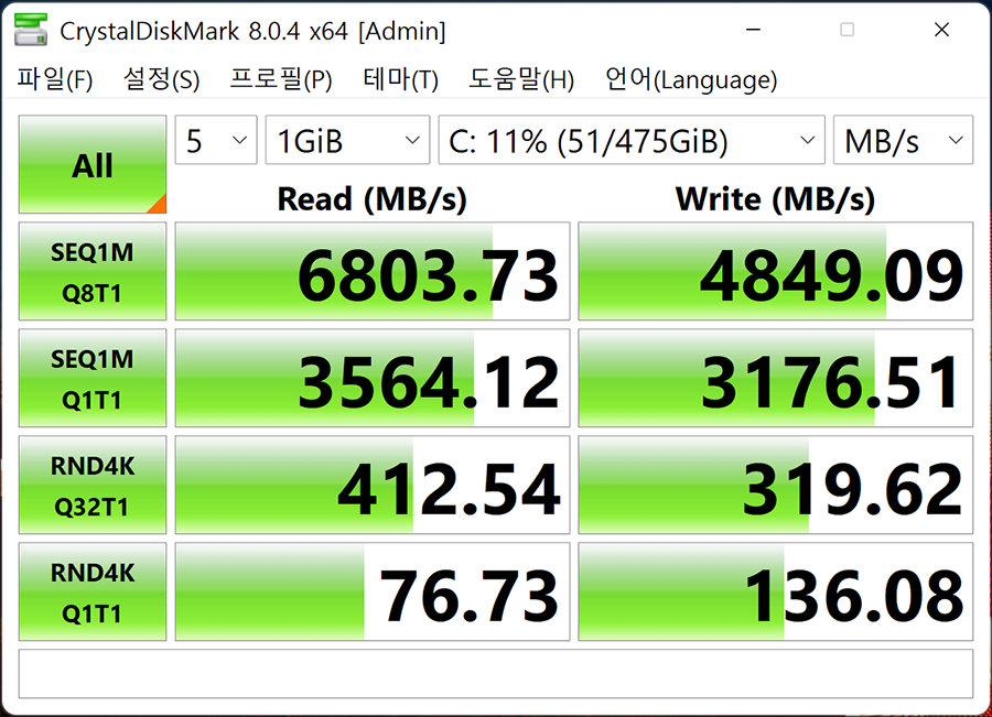 스토리지의 경우 최대읽기속도 6803MB/s, 최대쓰기속도 4849MB/s로 매우 빠른 속도를 가지고 있네요. 덕분에 체감 성능도 매우 빨랐습니다.