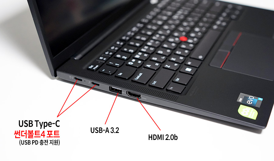 좌측에는 2개의 썬더볼트4 포트 (USB Type-C 포트, USB PD 충전 겸용), 그리고 USB-A 3.2 포트와 풀사이즈 HDMI 2.0b 포트가 있고...