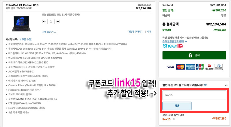 씽크패드 노트북을 저렴하게 구입하는 방법: 쿠폰코드 link15