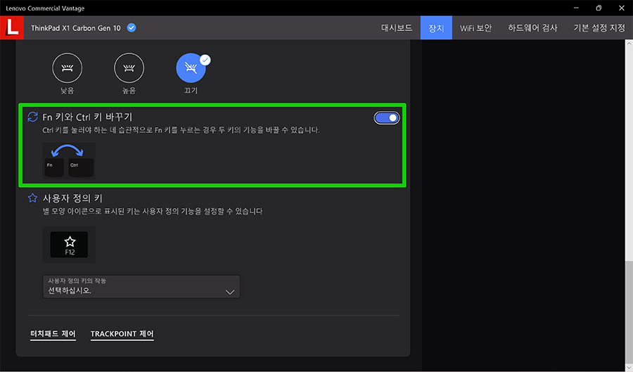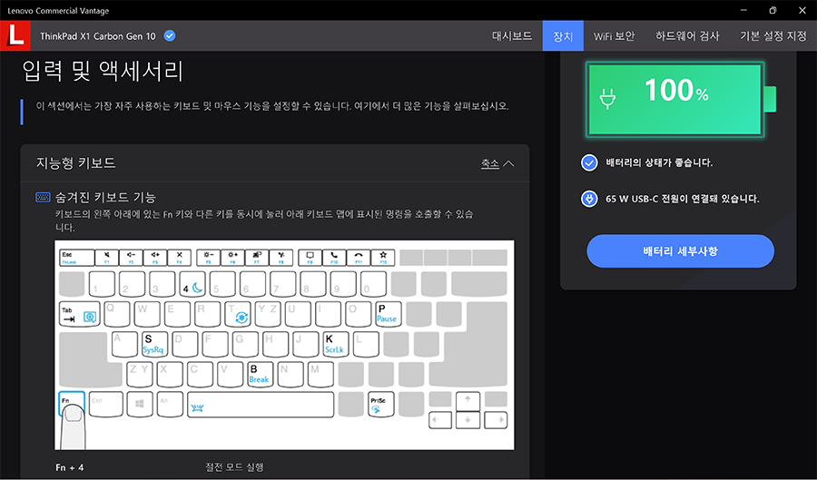 제 경우에는 레노버 노트북의 시스템과 설정을 관리할 수 있는 레노버 밴티지(Vantage)을 매우 좋아하는 편인데요. 씽크패드를 사용할 때 가장 먼저 활성화 하는 기능이 바로 Fn키와 Control 키의 위치를 바꾸는 것입니다. '장치' 옵션에서 잘 찾아보면 되는데, 씽크패드의 경우 아래처럼...
