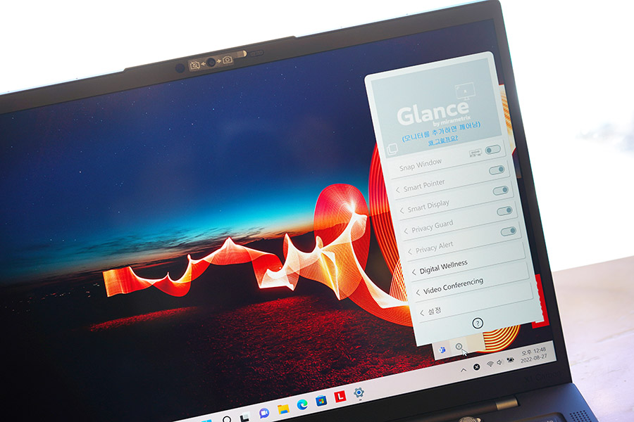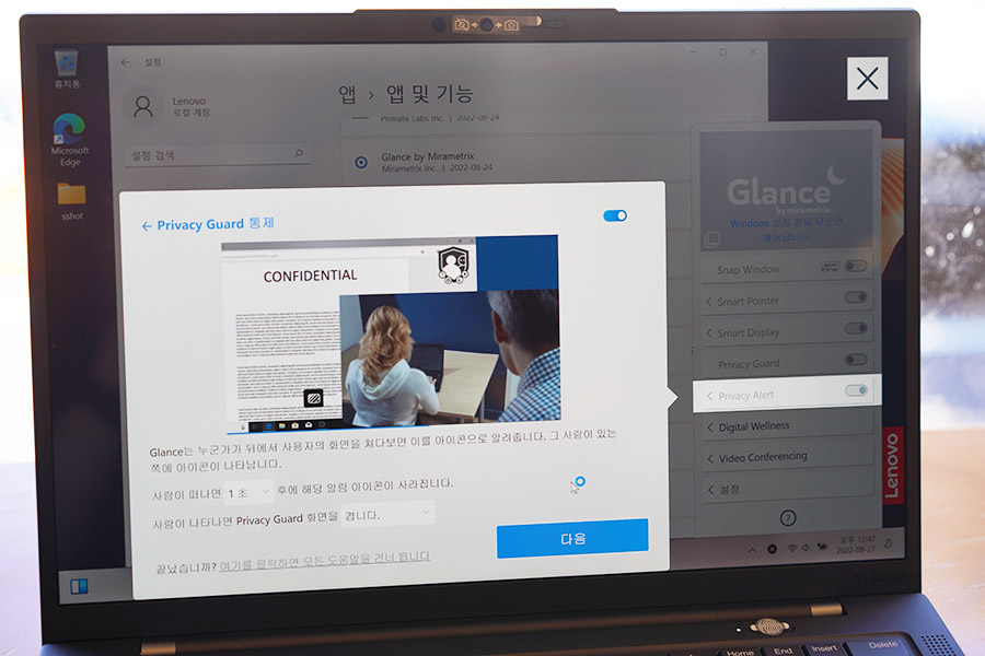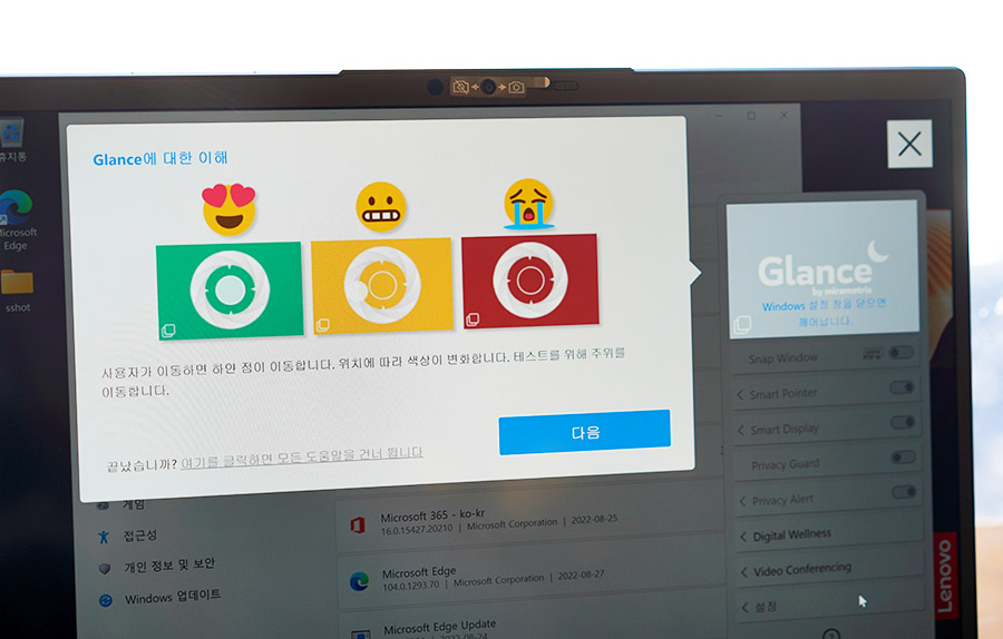 보안 기능에 대해서 조금 더 리뷰해보면, 내가 잠깐 자리를 떠났을 때나 뒤에 있는 사람이 내 화면을 보고 있는지를 IR 센서 카메라를 통해 인식해서 화면을 흐리게 해주거나 알려주는 기능을 활성화 할 수 있습니다. 바로 Glance라는 앱을 통해 가능한데요.