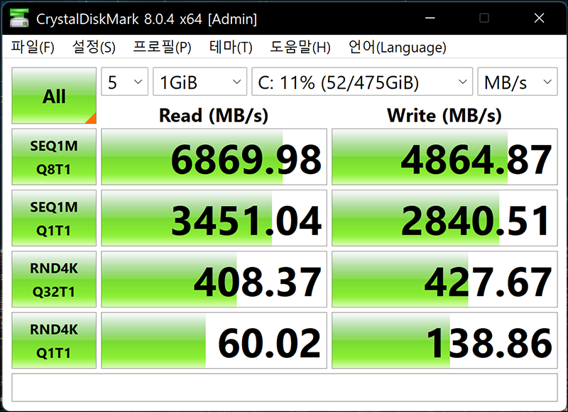 탑재된 SSD 스토리지 속도는 최대읽기속도 6869MB/s, 최대쓰기속도 4864MB/s입니다. 덕분에 어떤 작업을 해도 딜레이가 발생하지 않아 성능면에서 매우 만족스러웠습니다.