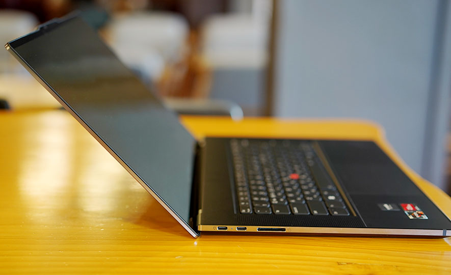힌지 부분은 위와 같은 각도까지 펼쳐집니다. 기존 씽크패드 노트북들이 180도 펼쳐지는 힌지 구조를 가지고 있었다면, 씽크패드Z16은 그렇지는 않네요.