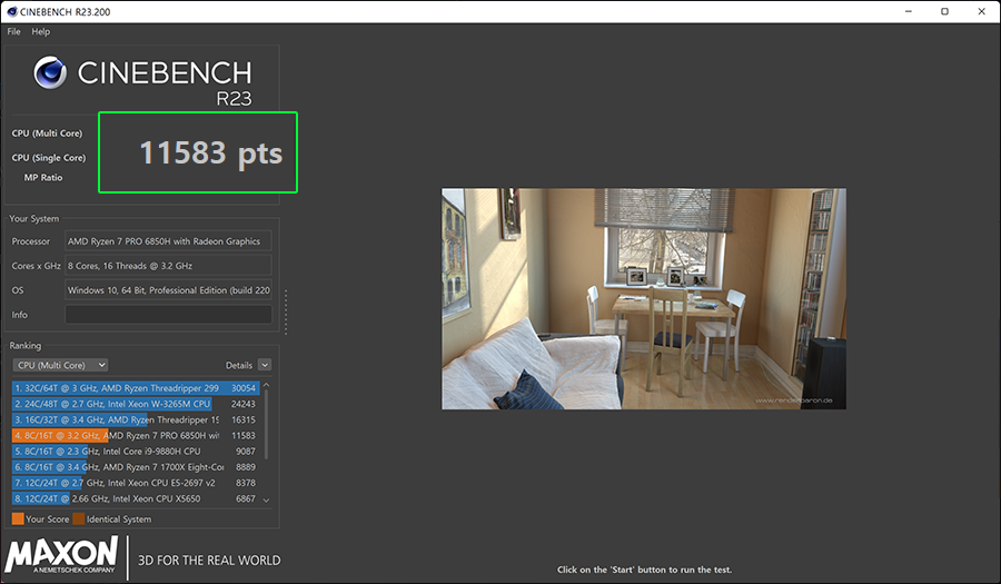 자 그럼 싱크패드 Z16의 성능은 얼마나 나올까요? 고성능 AMD 라이젠7 6850H를 씨네벤치R23 벤치마크를 돌려보니 11583점이 나왔습니다. 사실상 왠만한 게이밍 노트북에 준하는 성능이네요. 그래픽카드 AMD 라데온 RX 6500M이 들어가 있어서 그런지 게이밍 노트북으로 활용해도 될 것 같다는 생각이 듭니다.
