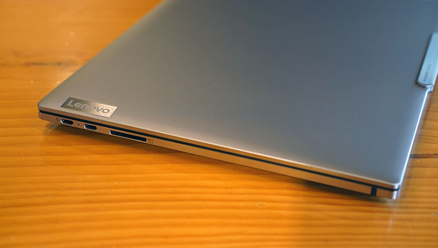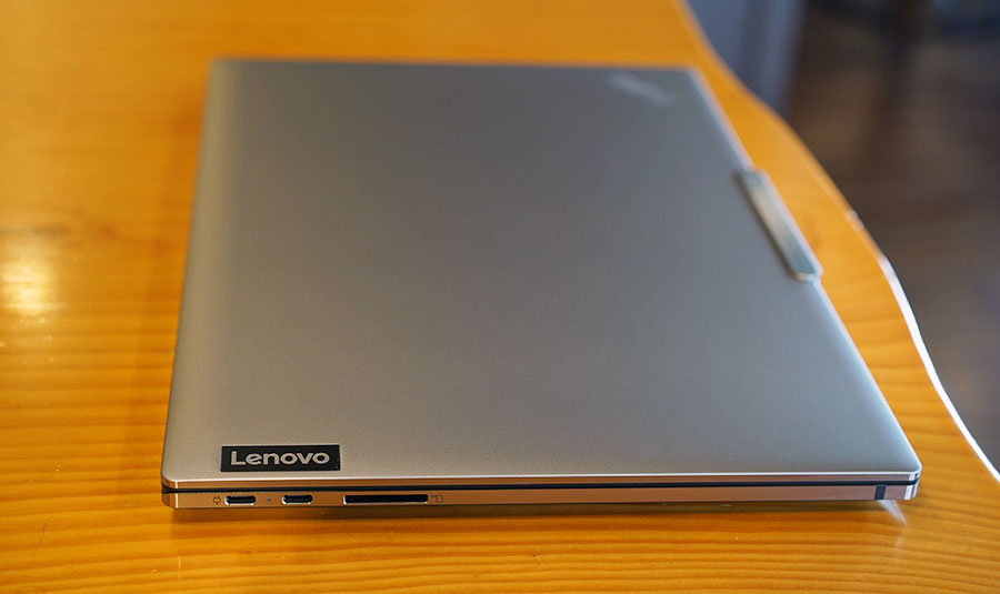 꽤 슬림한 디자인으로, 우측 면에는 파워 버튼, 3.5mm 헤드셋 포트, USB Type-C 포트, 그리고 켄싱턴 나노 락이 있습니다.