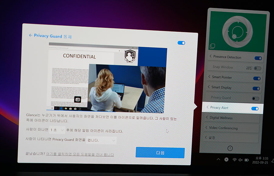 열심히 작업을 하고 있는데 뒤에서 내 작업물을 누가 보고 있는지도 감지해내서 알려주는 Privacy Alert 기능도 있어서 은근 유용할 때가 있었습니다. 회사에서 업무용 노트북으로 사용을 하거나, 보안이 중요한 업무를 하는 경우라면 해당 기능을 적극 사용해보는 것도 좋겠다는 생각이 듭니다.