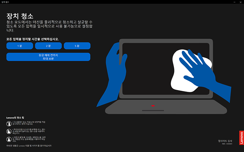 주로 터치스크린을 사용하다보면 화면에 지문이 많이 묻을 떄가 있는데, 화면이나 키보드를 컴퓨터를 킨 상태에서 깨끗하게 닦고 싶다면 'Clean your Device'라는 앱을 통해서 지정한 시간동안 키와 터치입력을 막아둘 수 있습니다. 직접 사용해보니 꽤 유용하더군요. 보통 1분 정도만 입력을 막아두고, 스크린과 키보드를 청소하면 됩니다.