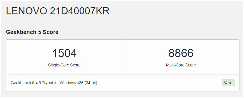 긱벤치5로 측정해보니 멀티코어 8866점이 나옵니다. 상당한 고성능으로 영상편집과 같은 크리에이터 작업을 하는 노트북으로 손색이 없네요.
