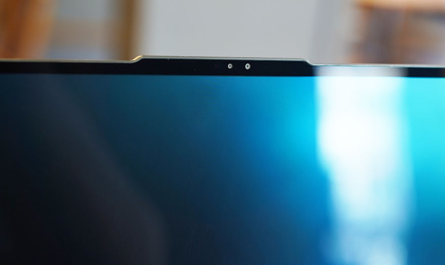 바로 모니터 윗면에 위치하고 있는 전면 카메라 부분입니다. 여기에는 화상 회의를 위한 듀얼 어레이 마이크 그리고 밝은 조리개를 가진 FHD 카메라 + IR센서가 있죠.