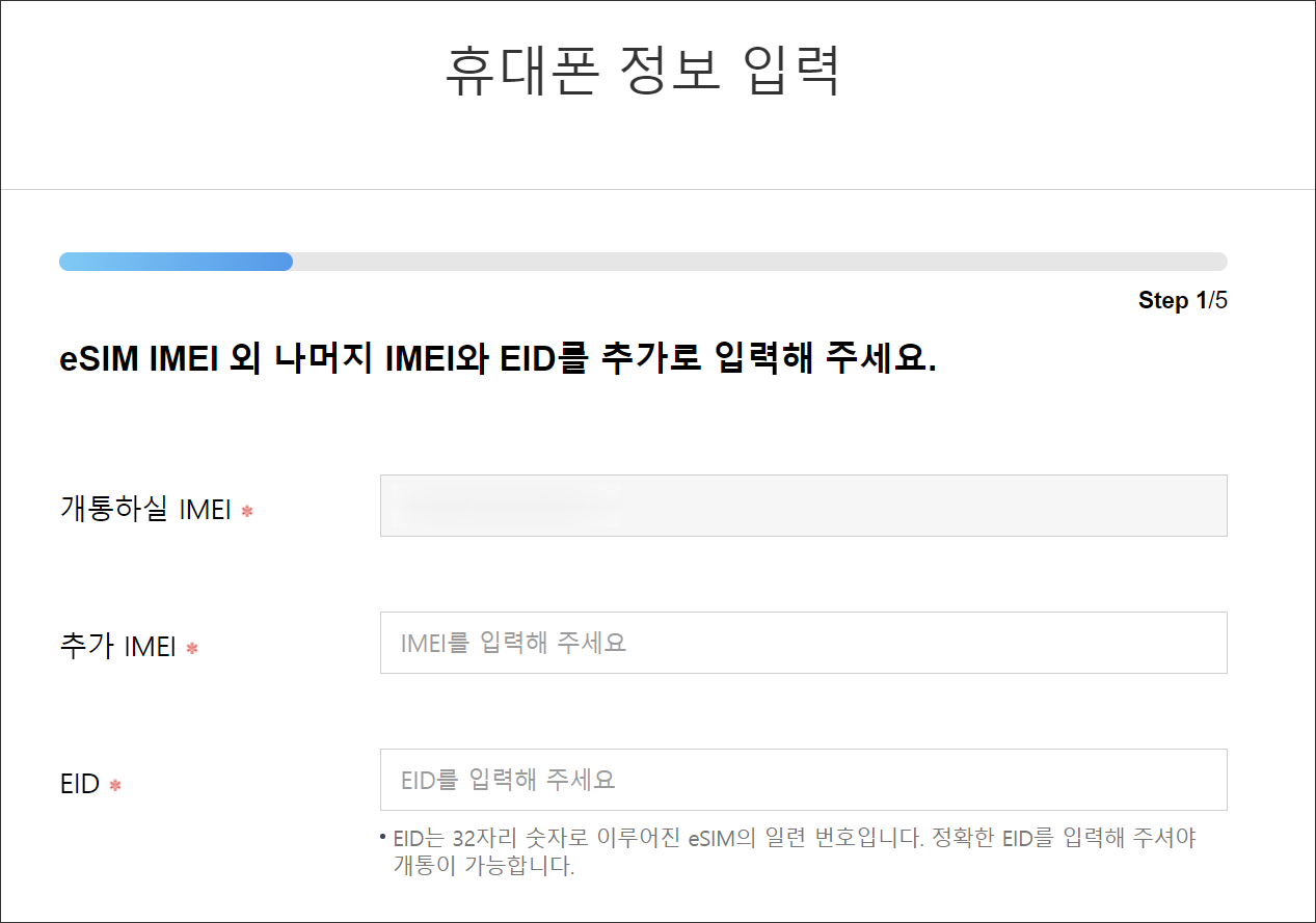 e심으로 개통을 하기 위해서 휴대폰 정보 입력을 먼저 하게 되는데요. 개통하실 IMEI란에는 아이폰 설정 > 일반 > 정보로 이동한 다음에 ESIM 필드에 있는 IMEI 번호를 입력하고, 추가 IMEI는 IMEI2를 입력하고, EID역시 잘 찾아서 입력을 하면 됩니다 (EID는 ESIM 위에 보면 있습니다)