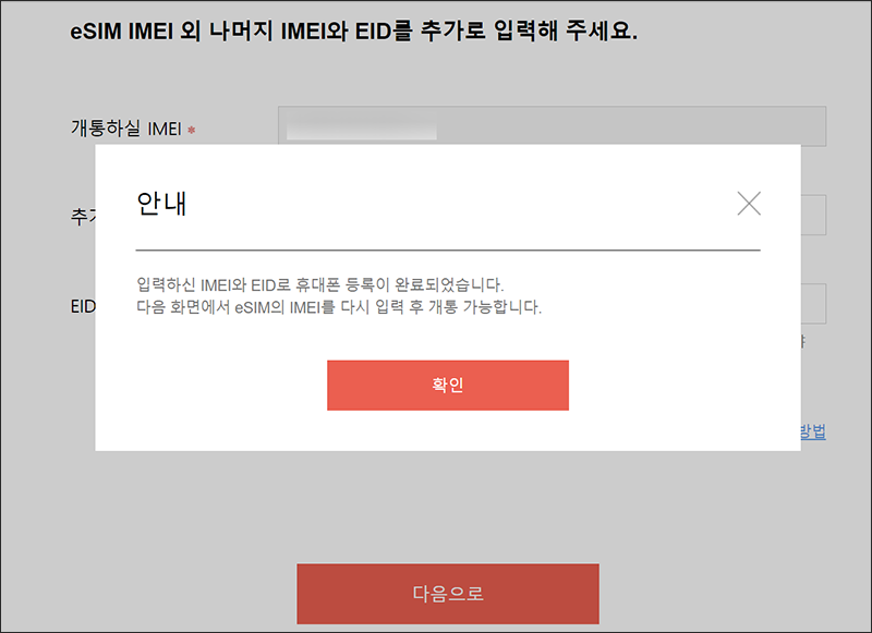 위에 과정을 처음하게 되면 eSIM 개통 전에 SKT에 OMD(Open Market Device)단말기로 먼저 등록이 되는 것 같습니다. '다음으로' 버튼을 누른 뒤 5~6초 뒤에 기다려야 하니 조금 느긋하게 기다려보세요.