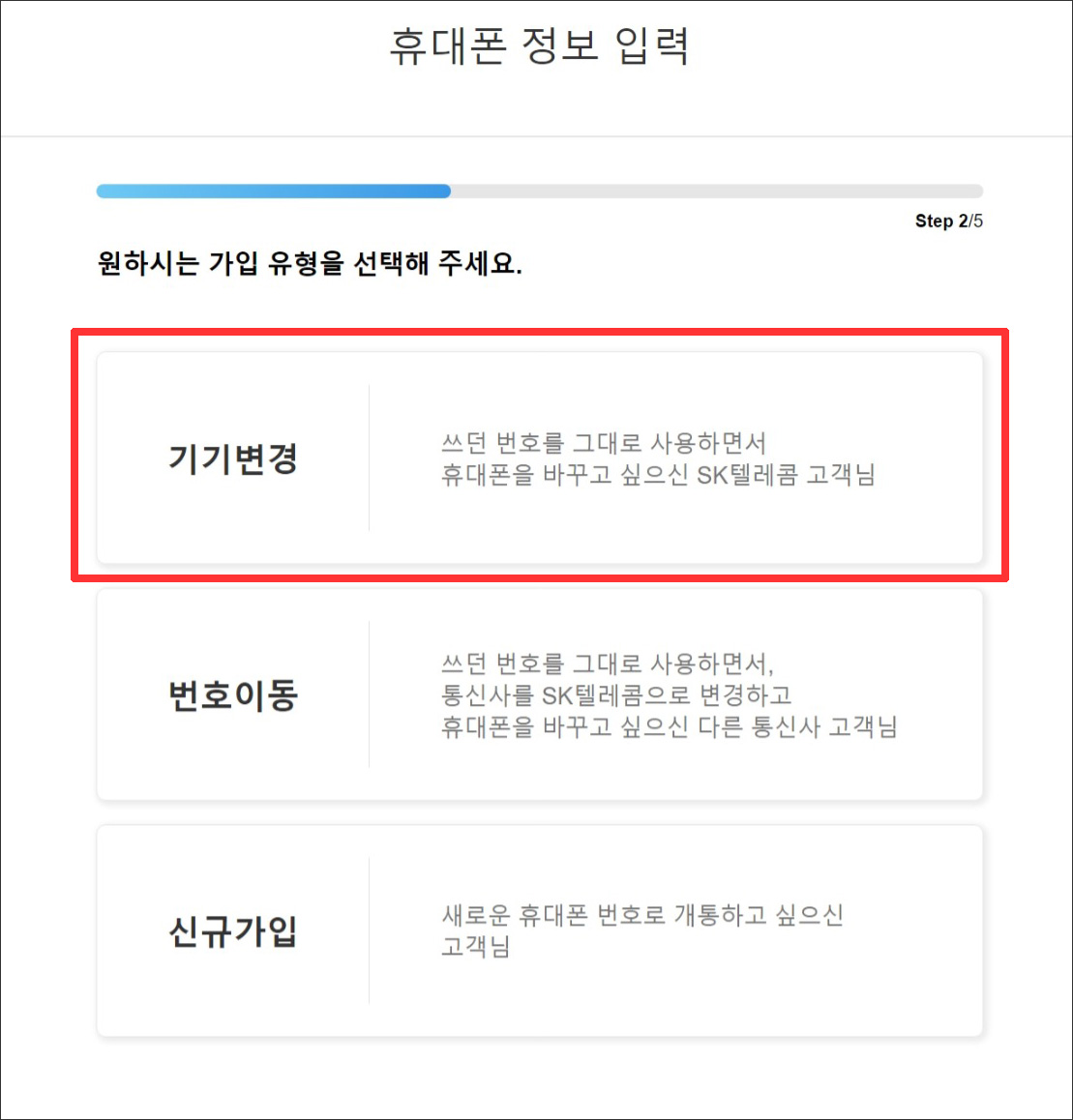 보통은 사용하던 요금제 그대로, 요금제 변경 없이 넘어가시는 분들이 많기 때문에 '기기변경'을 선택하시면 됩니다.
