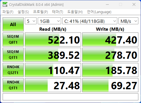 기본으로 꾸민 SSD 스토리지 속도는 최대읽기속도 522MB/s, 최대쓰기 속도 427MB/s입니다.