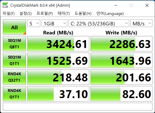 스토리지 속도로 측정해보았습니다. 최대 읽기속도 3424MB/s, 최대 쓰기속도 2286MB/s를 자랑합니다.