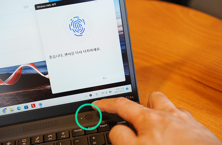 파워 버튼을 잘 살펴보면, 지문인식 센서를 탑재한 모델의 경우 파워버튼에 통합이 되어 있습니다. 그래서 아래와 같이 윈도우 헬로 기능을 사용할 때 손가락을 파워 버튼에 살짝 가져다 되는 것으로 잠금해제를 할 수 있죠.