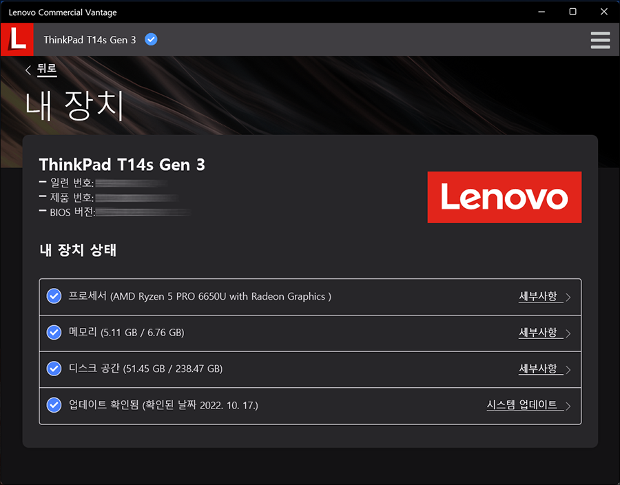 일단 제가 리뷰에 사용한 씽크패드 T14s 3세대 모델은 AMD 라이젠5 프로 6650U 프로세서, 그리고 DDR5 8GB 램을 탑재한 모델입니다. 라이젠7와 16GB 램 모델을 선택한다면 더욱 더 향상된 성능을 기대할 수 있으니 아래 벤치마크 결과는 참고만 해주시면 될 것 같네요.
