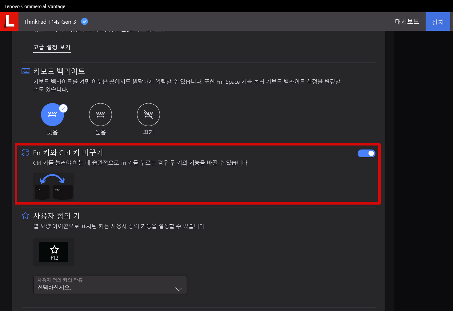 참고로 Fn키와 Ctrl키의 경우 콘트롤 키가 바깥에 있는 것이 익숙한 유저들을 위해서 BIOS 셋업이나 Lenovo Vantage 소프트웨어를 통해 스위칭이 가능합니다. 아래에서 보이시는 것처럼 Fn키와 Ctrl 키 바꾸기 옵션을 활성화 하면, 서로의 위치가 바뀌게 되죠.