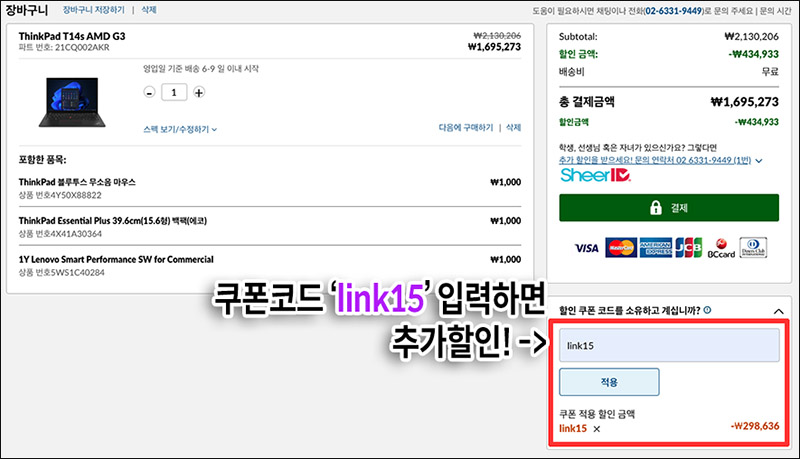 신제품 씽크패드 노트북인 ThinkPad T14s 3세대 모델에 관심이 있으신 분들은 구입하실 때 장바구니 할인 쿠폰코드 link15를 입력해보세요. 씽크패드나 리전, 아이디어패드 등 레노버 노트북을 구입하실 때 추가할인을 받을 수 있는 쿠폰코드 입니다.