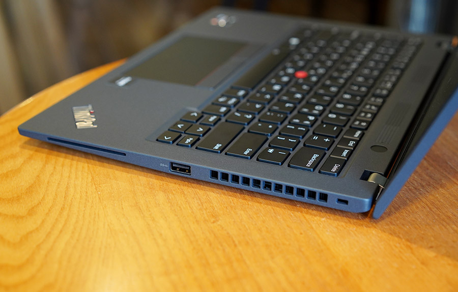 그리고 오른쪽에는 USB-A 포트가 하나 더 있고, 켄싱턴 나노락 잠금장치를 확인할 수 있습니다. 2개의 USB-A 리거시 포트와 2개의 USB Type-c 포트를 가지고 있어서, 씽크패드 T14s 3세대 모델을 사용하면서 확장성 면에서 부족했던 상황은 없는 것 같네요.