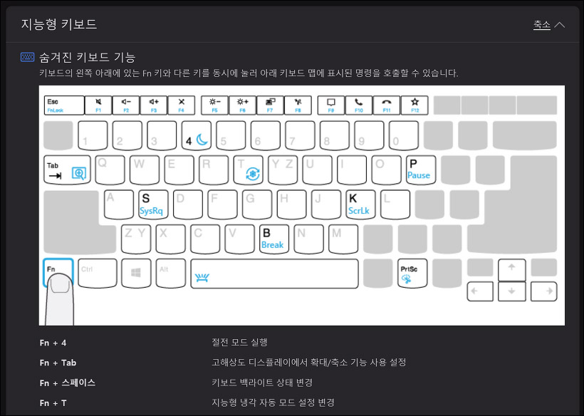 단축키로 Fn+T키를 누르게 되면, AI 냉각모드를 제어할 수가 있는데요. 자동모드를 사용하면 현재 하고 있는 작업에 맞추어 알아서 전원관리와 냉각을 챙겨주니 편하더군요. 참고로 이러한 단축키는 레노버 노트북 전용 관리 소프트웨어인 Lenovo Vantage 안에서 확인해볼 수 있습니다. 일부 키들의 단축키는 숨겨저 있어서...