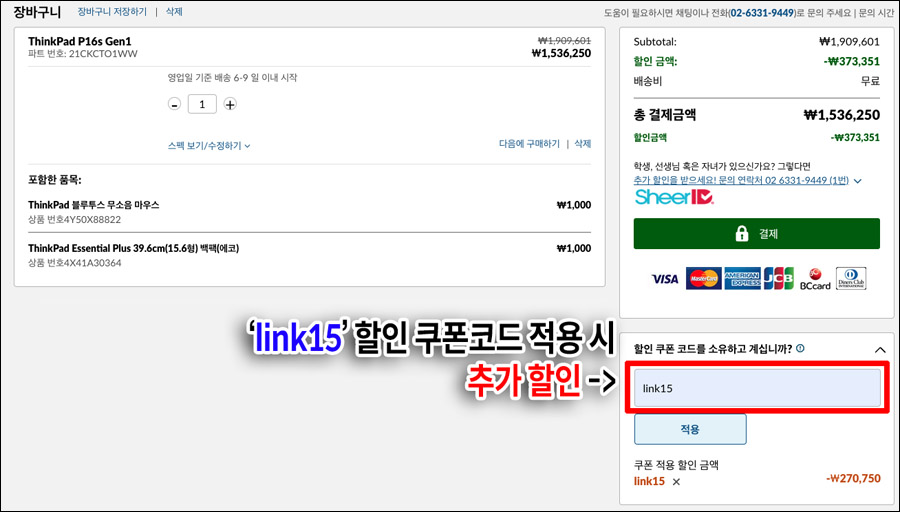 레노버 공홈에서 구입할 때 장바구니에 'link15' 할인 쿠폰코드를 입력하면 추가할인을 받으실 수 있으니 참고하시기 바랍니다. :)